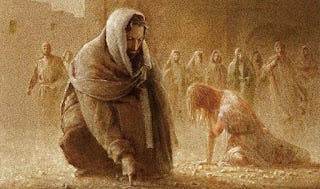 Then each of them went home, while Jesus went to the Mount of Olives. Early in the morning he came again to the temple. All the people came to him and he sat down and began to teach them. The scribes and the Pharisees brought a woman who had been caught in adultery; and making her stand before all of them, they said to him, "Teacher, this woman was caught in the very act of committing adultery. Now in the law Moses commanded us to stone such women. Now what do you say?" They said this to test him, so that they might have some charge to bring against him. Jesus bent down and wrote with his finger on the ground. When they kept on questioning him, he straightened up and said to them, "Let anyone among you who is without sin be the first to throw a stone at her." And once again he bent down and wrote on the ground. When they heard it, they went away, one by one, beginning with the elders; and Jesus was left alone with the woman standing before him. Jesus straightened up and said to her, "Woman, where are they? Has no one condemned you?" She said, "No one, sir." And Jesus said, "Neither do I condemn you. Go your way, and from now on do not sin again." - John 7:53-8:11