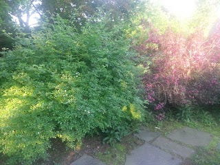 Well, the other day, I grabbed the clippers and set out to trim back the bush to free up the threatened plants. I managed to cut back a decent amount of branches, but then had to stop. In the center of the bush is a bird's nest.