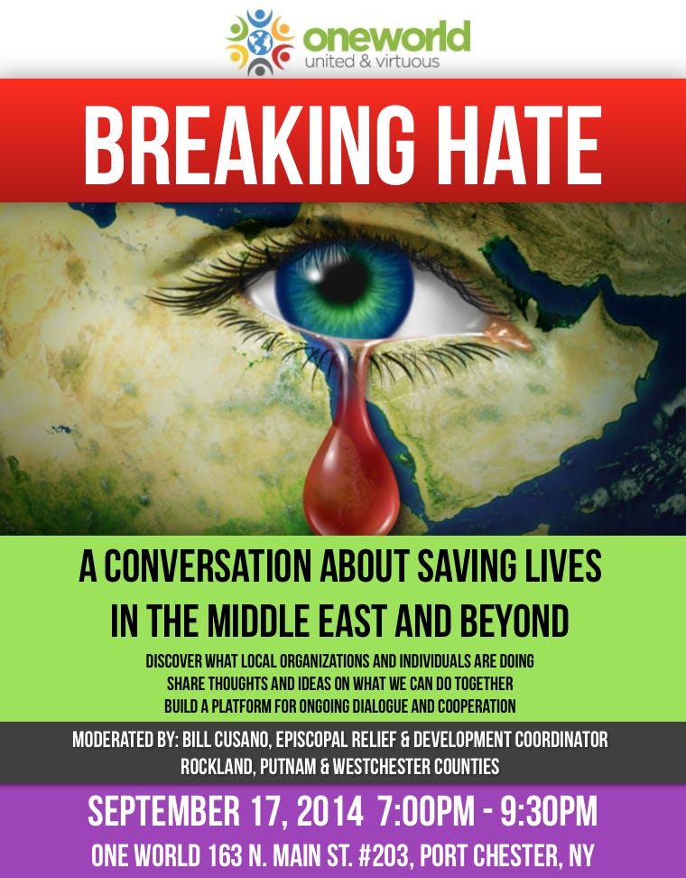 On September 17th, we will be holding a community meeting entitled Breaking Hate, to talk openly about saving lives in the war-torn Middle East. It is a lofty goal, and just having a discussion can result in a battleground, but it is a baby step that we need to take.