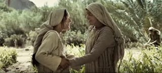 So, she goes to Elizabeth and stays with her through the final weeks of Elizabeth's term, helping the older cousin possibly as a midwife.