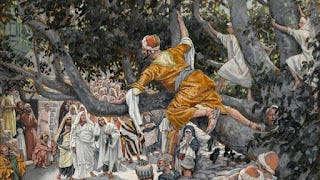 He entered Jericho and was passing through it. A man was there named Zacchaeus; he was a chief tax-collector and was rich. He was trying to see who Jesus was, but on account of the crowd he could not, because he was short in stature. So he ran ahead and climbed a sycamore tree to see him, because he was going to pass that way. When Jesus came to the place, he looked up and said to him, ‘Zacchaeus, hurry and come down; for I must stay at your house today.’ So he hurried down and was happy to welcome him. All who saw it began to grumble and said, ‘He has gone to be the guest of one who is a sinner.’ Zacchaeus stood there and said to the Lord, ‘Look, half of my possessions, Lord, I will give to the poor; and if I have defrauded anyone of anything, I will pay back four times as much.’ Then Jesus said to him, ‘Today salvation has come to this house, because he too is a son of Abraham. For the Son of Man came to seek out and to save the lost.’ - Luke 19:1-10