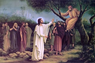 He entered Jericho and was passing through it. A man was there named Zacchaeus; he was a chief tax collector and was rich. He was trying to see who Jesus was, but on account of the crowd he could not, because he was short in stature. So he ran ahead and climbed a sycamore tree to see him, because he was going to pass that way. When Jesus came to the place, he looked up and said to him, "Zacchaeus, hurry and come down; for I must stay at your house today." So he hurried down and was happy to welcome him. All who saw it began to grumble and said, "He has gone to be the guest of one who is a sinner." Zacchaeus stood there and said to the Lord, "Look, half of my possessions, Lord, I will give to the poor; and if I have defrauded anyone of anything, I will pay back four times as much." Then Jesus said to him, "Today salvation has come to this house, because he too is a son of Abraham. For the Son of Man came to seek out and to save the lost." - Luke 19:1-10