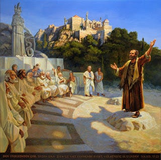 Paul stood in front of the Areopagus and said, “Athenians, I see how extremely religious you are in every way. For as I went through the city and looked carefully at the objects of your worship, I found among them an altar with the inscription, ‘To an unknown god.’ What therefore you worship as unknown, this I proclaim to you. The God who made the world and everything in it, he who is Lord of heaven and earth, does not live in shrines made by human hands, nor is he served by human hands, as though he needed anything, since he himself gives to all mortals life and breath and all things. From one ancestor he made all nations to inhabit the whole earth, and he allotted the times of their existence and the boundaries of the places where they would live, so that they would search for God and perhaps grope for him and find him—though indeed he is not far from each one of us. For ‘In him we live and move and have our being’; as even some of your own poets have said, ‘For we too are his offspring.’ Since we are God’s offspring, we ought not to think that the deity is like gold, or silver, or stone, an image formed by the art and imagination of mortals. While God has overlooked the times of human ignorance, now he commands all people everywhere to repent, because he has fixed a day on which he will have the world judged in righteousness by a man whom he has appointed, and of this he has given assurance to all by raising him from the dead.” - Acts 17:22-31