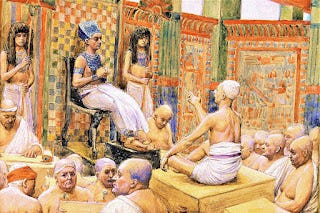 Then Pharaoh sent for Joseph, and he was hurriedly brought out of the dungeon. When he had shaved himself and changed his clothes, he came in before Pharaoh. And Pharaoh said to Joseph, "I have had a dream, and there is no one who can interpret it. I have heard it said of you that when you hear a dream you can interpret it." Joseph answered Pharaoh, "It is not I; God will give Pharaoh a favorable answer." Then Pharaoh said to Joseph, "In my dream I was standing on the banks of the Nile; and seven cows, fat and sleek, came up out of the Nile and fed in the reed grass. Then seven other cows came up after them, poor, very ugly, and thin. Never had I seen such ugly ones in all the land of Egypt. The thin and ugly cows ate up the first seven fat cows, but when they had eaten them no one would have known that they had done so, for they were still as ugly as before. Then I awoke. I fell asleep a second time and I saw in my dream seven ears of grain, full and good, growing on one stalk, and seven ears, withered, thin, and blighted by the east wind, sprouting after them; and the thin ears swallowed up the seven good ears. But when I told it to the magicians, there was no one who could explain it to me." Then Joseph said to Pharaoh, "Pharaoh's dreams are one and the same; God has revealed to Pharaoh what he is about to do. The seven good cows are seven years, and the seven good ears are seven years; the dreams are one. The seven lean and ugly cows that came up after them are seven years, as are the seven empty ears blighted by the east wind. They are seven years of famine. It is as I told Pharaoh; God has shown to Pharaoh what he is about to do. There will come seven years of great plenty throughout all the land of Egypt. After them there will arise seven years of famine, and all the plenty will be forgotten in the land of Egypt; the famine will consume the land. The plenty will no longer be known in the land because of the famine that will follow, for it will be very grievous. And the doubling of Pharaoh's dream means that the thing is fixed by God, and God will shortly bring it about. Now therefore let Pharaoh select a man who is discerning and wise, and set him over the land of Egypt. Let Pharaoh proceed to appoint overseers over the land, and take one-fifth of the produce of the land of Egypt during the seven plenteous years. Let them gather all the food of these good years that are coming, and lay up grain under the authority of Pharaoh for food in the cities, and let them keep it. That food shall be a reserve for the land against the seven years of famine that are to befall the land of Egypt, so that the land may not perish through the famine." The proposal pleased Pharaoh and all his servants. Pharaoh said to his servants, "Can we find anyone else like this-- one in whom is the spirit of God?" So Pharaoh said to Joseph, "Since God has shown you all this, there is no one so discerning and wise as you. You shall be over my house, and all my people shall order themselves as you command; only with regard to the throne will I be greater than you." And Pharaoh said to Joseph, "See, I have set you over all the land of Egypt." Removing his signet ring from his hand, Pharaoh put it on Joseph's hand; he arrayed him in garments of fine linen, and put a gold chain around his neck. He had him ride in the chariot of his second-in-command; and they cried out in front of him, "Bow the knee!" Thus he set him over all the land of Egypt. Moreover Pharaoh said to Joseph, "I am Pharaoh, and without your consent no one shall lift up hand or foot in all the land of Egypt." Pharaoh gave Joseph the name Zaphenath-paneah; and he gave him Asenath daughter of Potiphera, priest of On, as his wife. Thus Joseph gained authority over the land of Egypt. - Gen. 41:14-45