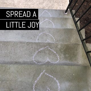 I went outside this morning to get the newspaper and each step up to our door was decorated with a purple heart. The family next door was out in the courtyard yesterday and the kids were decorating the sidewalks with chalk, as they have been doing everyday, weather permitting.