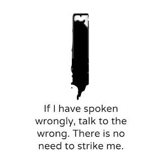 Then the high priest questioned Jesus about his disciples and about his teaching. Jesus answered, 'I have spoken openly to the world; I have always taught in synagogues and in the temple, where all the Jews come together. I have said nothing in secret. Why do you ask me? Ask those who heard what I said to them; they know what I said.' When he had said this, one of the police standing nearby struck Jesus on the face, saying, 'Is that how you answer the high priest?' Jesus answered, 'If I have spoken wrongly, testify to the wrong. But if I have spoken rightly, why do you strike me?' Then Annas sent him bound to Caiaphas the high priest. - John 18:19-24