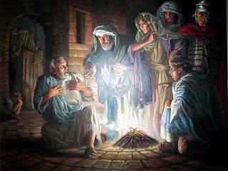 Then they seized him and led him away, bringing him into the high priest’s house. But Peter was following at a distance. When they had kindled a fire in the middle of the courtyard and sat down together, Peter sat among them. Then a servant-girl, seeing him in the firelight, stared at him and said, ‘This man also was with him.’ But he denied it, saying, ‘Woman, I do not know him.’ A little later someone else, on seeing him, said, ‘You also are one of them.’ But Peter said, ‘Man, I am not!’ Then about an hour later yet another kept insisting, ‘Surely this man also was with him; for he is a Galilean.’ But Peter said, ‘Man, I do not know what you are talking about!’ At that moment, while he was still speaking, the cock crowed. The Lord turned and looked at Peter. Then Peter remembered the word of the Lord, how he had said to him, ‘Before the cock crows today, you will deny me three times.’ And he went out and wept bitterly. Now the men who were holding Jesus began to mock him and beat him; they also blindfolded him and kept asking him, ‘Prophesy! Who is it that struck you?’ They kept heaping many other insults on him. When day came, the assembly of the elders of the people, both chief priests and scribes, gathered together, and they brought him to their council. They said, ‘If you are the Messiah, tell us.’ He replied, ‘If I tell you, you will not believe; and if I question you, you will not answer. But from now on the Son of Man will be seated at the right hand of the power of God.’ - Luke 22:54-69