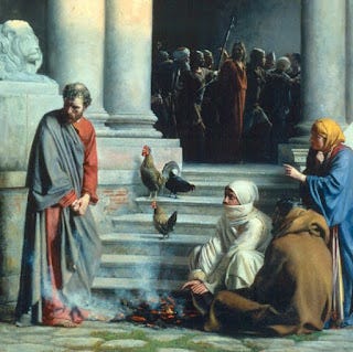 Simon Peter and another disciple followed Jesus. Since that disciple was known to the high priest, he went with Jesus into the courtyard of the high priest, but Peter was standing outside at the gate. So the other disciple, who was known to the high priest, went out, spoke to the woman who guarded the gate, and brought Peter in. The woman said to Peter, “You are not also one of this man’s disciples, are you?” He said, “I am not.” Now the slaves and the police had made a charcoal fire because it was cold, and they were standing around it and warming themselves. Peter also was standing with them and warming himself. Now Simon Peter was standing and warming himself. They asked him, “You are not also one of his disciples, are you?” He denied it and said, “I am not.” One of the slaves of the high priest, a relative of the man whose ear Peter had cut off, asked, “Did I not see you in the garden with him?” Again Peter denied it, and at that moment the cock crowed. - John 18:15-18,25-27