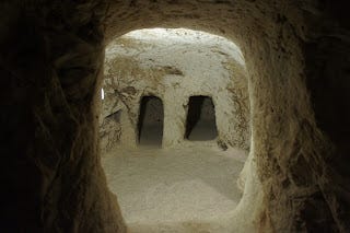 Inside, there was an open area where the body would be laid while it was prepared, wrapped in cloth with aloe and myrrh. This outer chamber could hold several bodies, either on the floor or on shelves along the walls, while the smaller, inner chambers were the final resting places for the bones, after the body decomposed.
